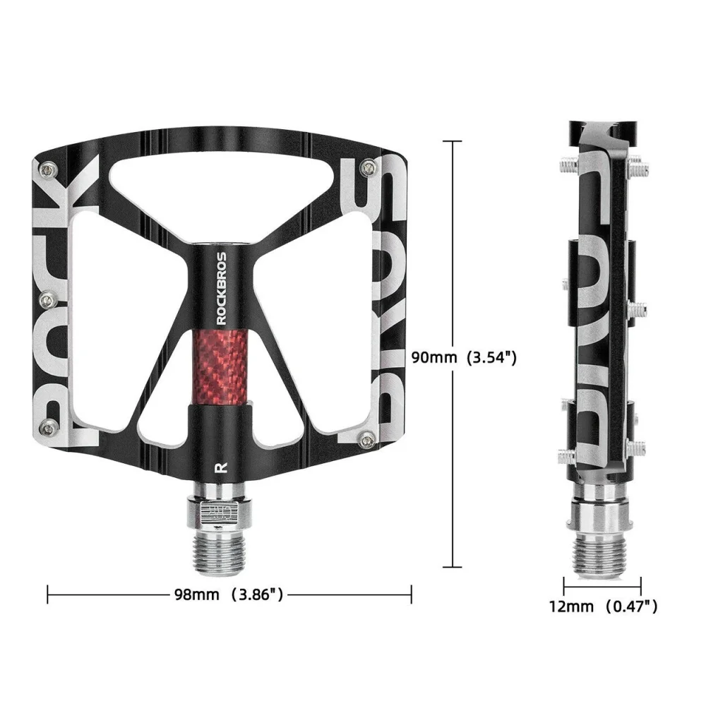 značka Rockbros, MTB pedále, oska 9/16, s 10 vymeniteľnými pinmi, platforma CNC čierny, eloxovaný dural s červeným karbónom, priemyselné ložisko v kombinácii LSL ložiska, rozmer : 9,8 x 9 x 2cm, váha 301g , balené v krabičke
