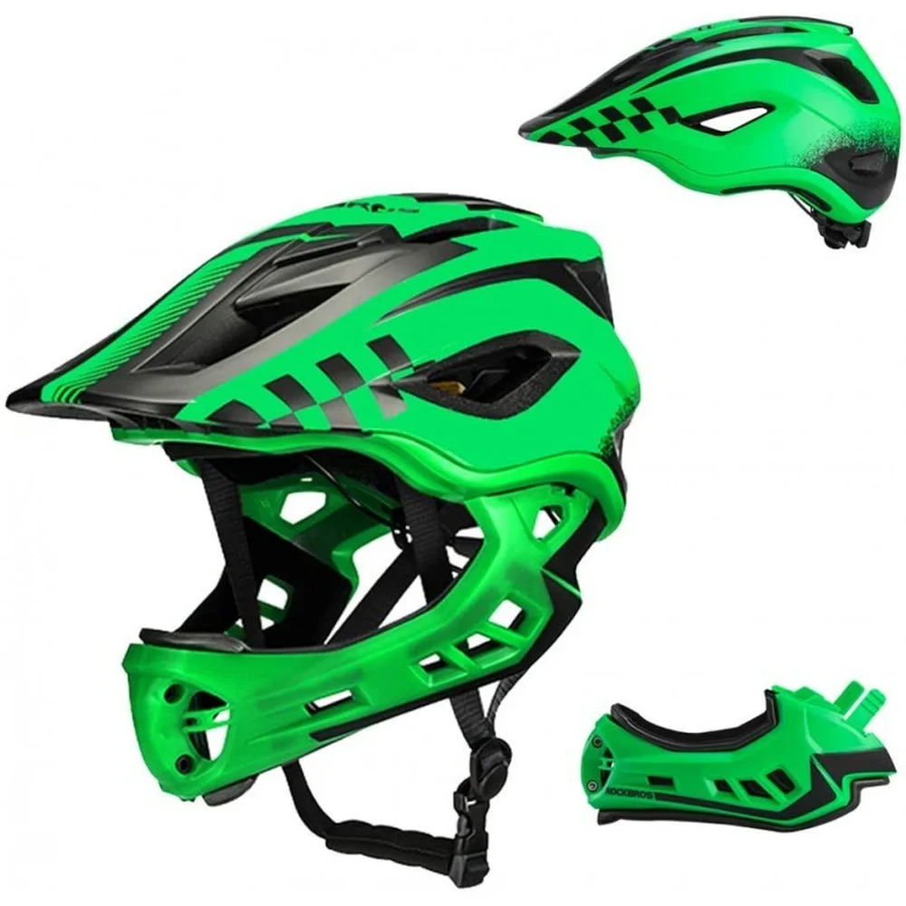 značka Rockbros, endurová prilba pre deti a mládež, veľ. M 53-58cm, váha 398g, zelená s čiernou potlačou, 12 veľkých otvorov na prilbe, IN-MOULDové prevedenie, s odnímateľným chráničom brady, s integorvaným šiltom, UPOZORNENIE:Prilby nevystavujte teplotám nad 60 stupňov, lebo môže dôjsť k deformácii ! ! !