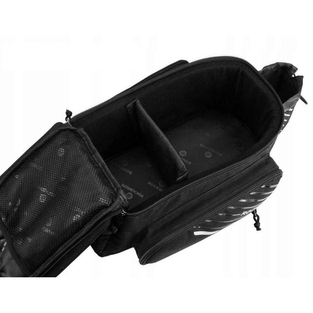 značka Rockbros, taška na bicykel je ideálna na dlhšie výlety na bicykli. Vďaka priloženému krytu proti dažďu je vhodný na použitie v akýchkoľvek podmienkach. Rozkladá sa (po stranách), nastaviteľný elastický popruh na hornej strane na prenášanie väčších predmetov, priestranné hlavné vrecko, objem: 10 l pred zložením, 12 l po zložení. Zapínanie na suchý zips. Vrecko na fľašu so sťahovacou šnúrkou na zadnej strane, Reflexné prvk, Ďalšie vrecká vo vnútri tašky (vrátane jedného zo sieťoviny). Držiak na pripevnenie napr. svetla na bicykel na zadnej strane, kryt proti dažďu na tašku je súčasťou balenia, možnosť nosenia tašky na ramene, hmotnosť: 665 g, materiál: 100% nylon