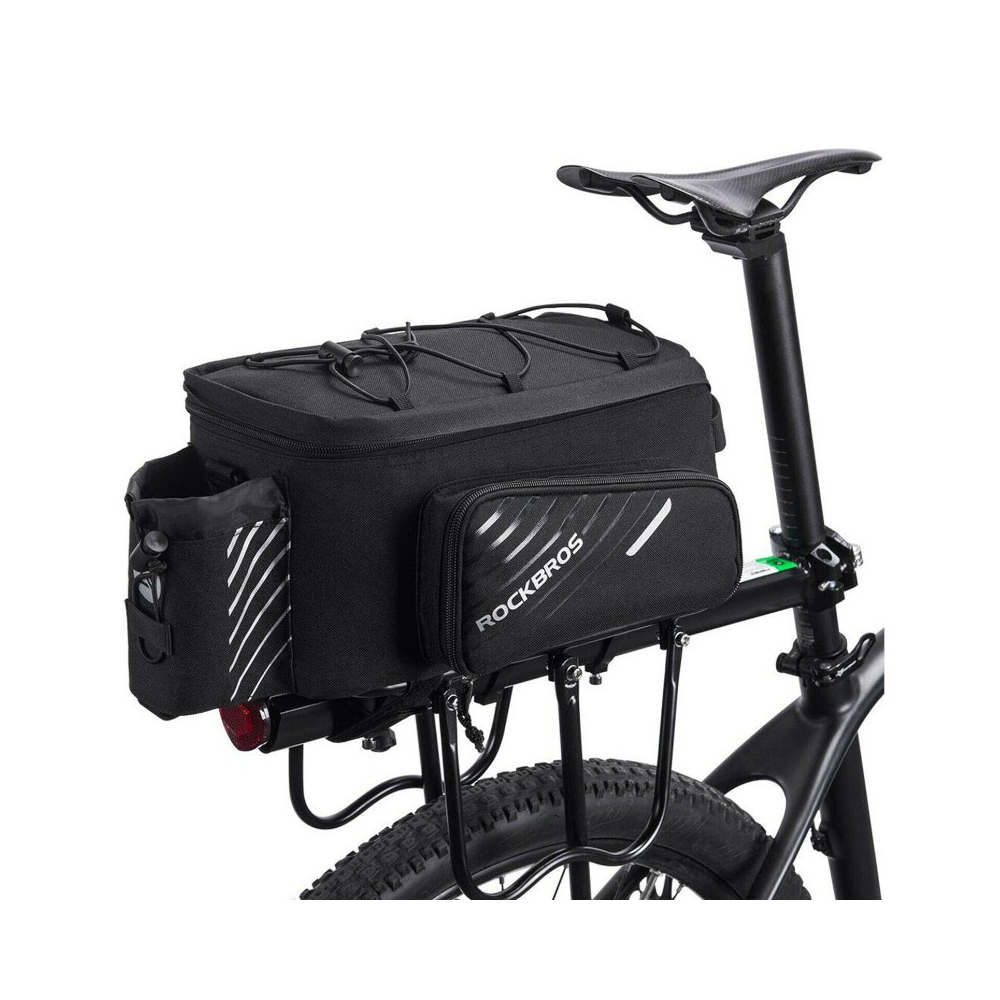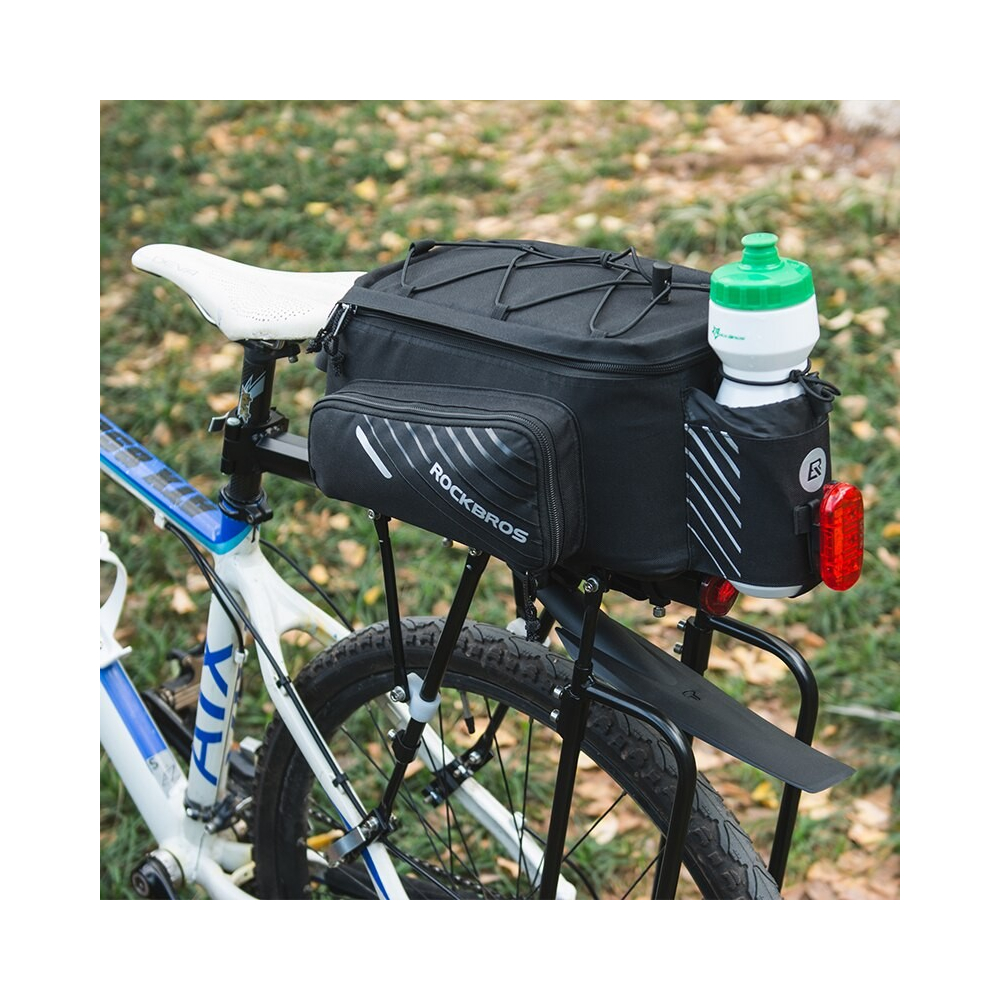 značka Rockbros, taška na bicykel je ideálna na dlhšie výlety na bicykli. Vďaka priloženému krytu proti dažďu je vhodný na použitie v akýchkoľvek podmienkach. Rozkladá sa (po stranách), nastaviteľný elastický popruh na hornej strane na prenášanie väčších predmetov, priestranné hlavné vrecko, objem: 10 l pred zložením, 12 l po zložení. Zapínanie na suchý zips. Vrecko na fľašu so sťahovacou šnúrkou na zadnej strane, Reflexné prvk, Ďalšie vrecká vo vnútri tašky (vrátane jedného zo sieťoviny). Držiak na pripevnenie napr. svetla na bicykel na zadnej strane, kryt proti dažďu na tašku je súčasťou balenia, možnosť nosenia tašky na ramene, hmotnosť: 665 g, materiál: 100% nylon