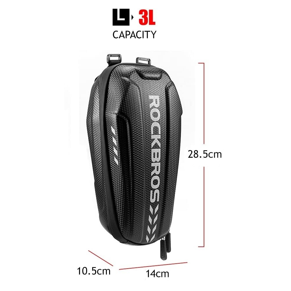 značka Rockbros, predná závesná taška s objemom 3l pre kolobežku je vyrobená z PU 3D Shell EVA materiálu, ktorý je vodotesný a má dlhú životnosť. Veľká kapacita 28,5x10,5x14cm. Cca 3litre. Pri ľahkom daždi taška chráni vaše veci. Jednoduchá montáž pomocou 32 cm dlhých suchých zipsov. Možno ich ľahko nastaviť, takže tašku jednoducho, rýchlo a bezpečne pripevníte na všetky bežné elektrické kolobežky. Spojovacia textília na oboch vnútorných stranách, zabraňuje pádu predmetov pri otvorení tašky, dizajn úložných priečinkov zabraňuje poškodeniu cenností, ako sú mobilné telefóny, kľúče ...
